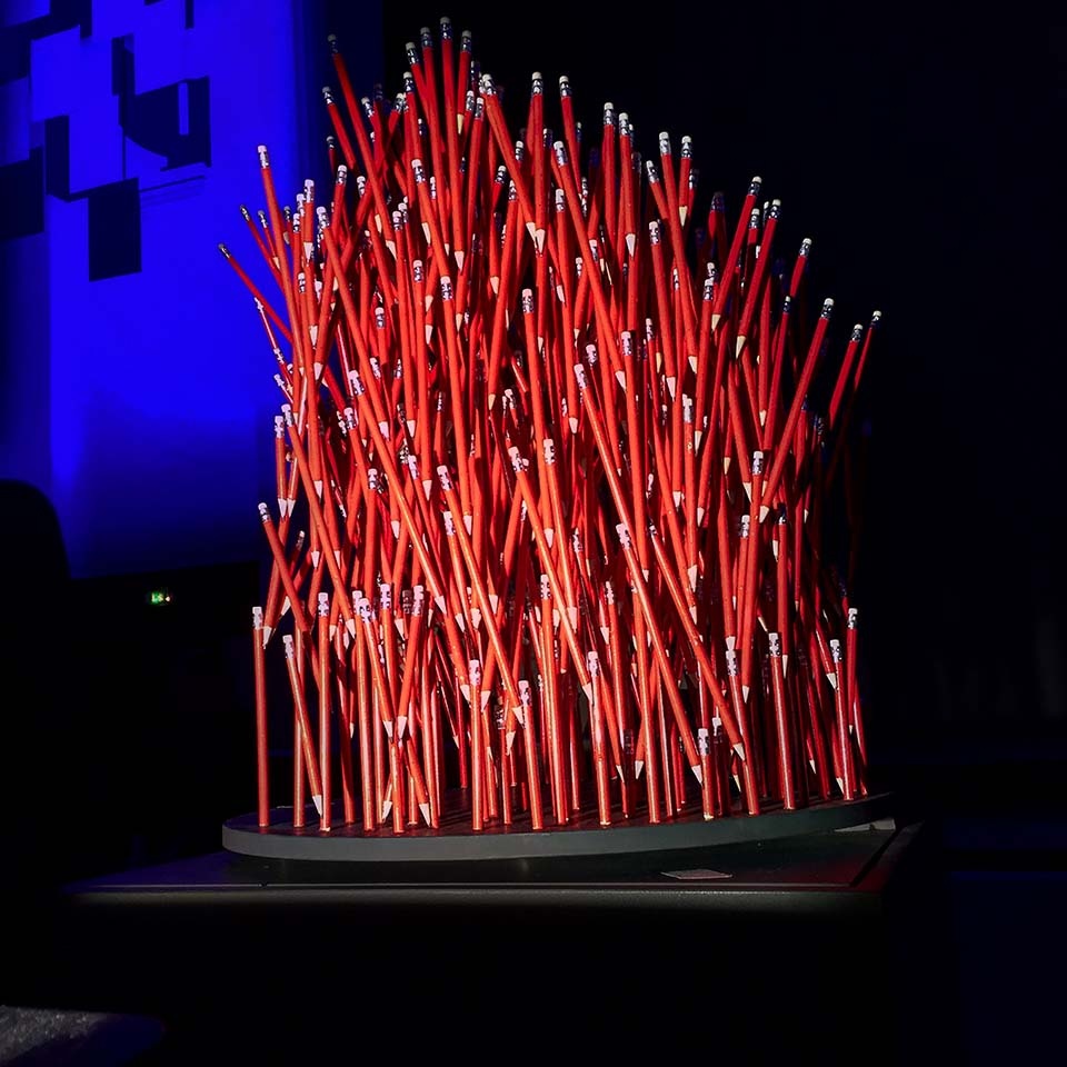 Für die Nannenpreisverleihung in der Kategorie Journalismus Whistleblower, habe ich eine Skulptur aus ca 1000 Bleistiften gebaut, deren Schatten wiederum ein Ohr und einen Flüsternden zeigt. Präsentiert von Karen Misoska.