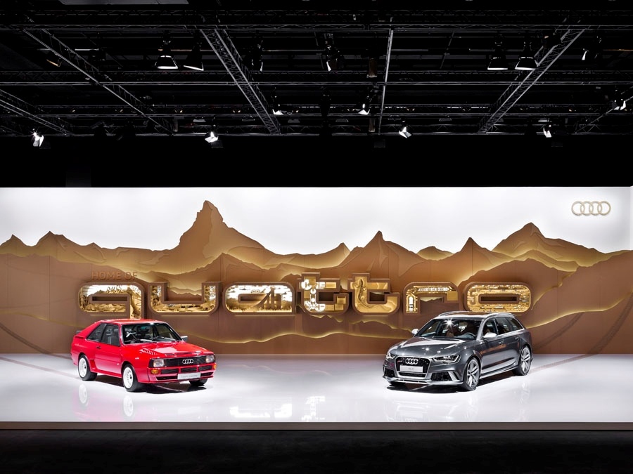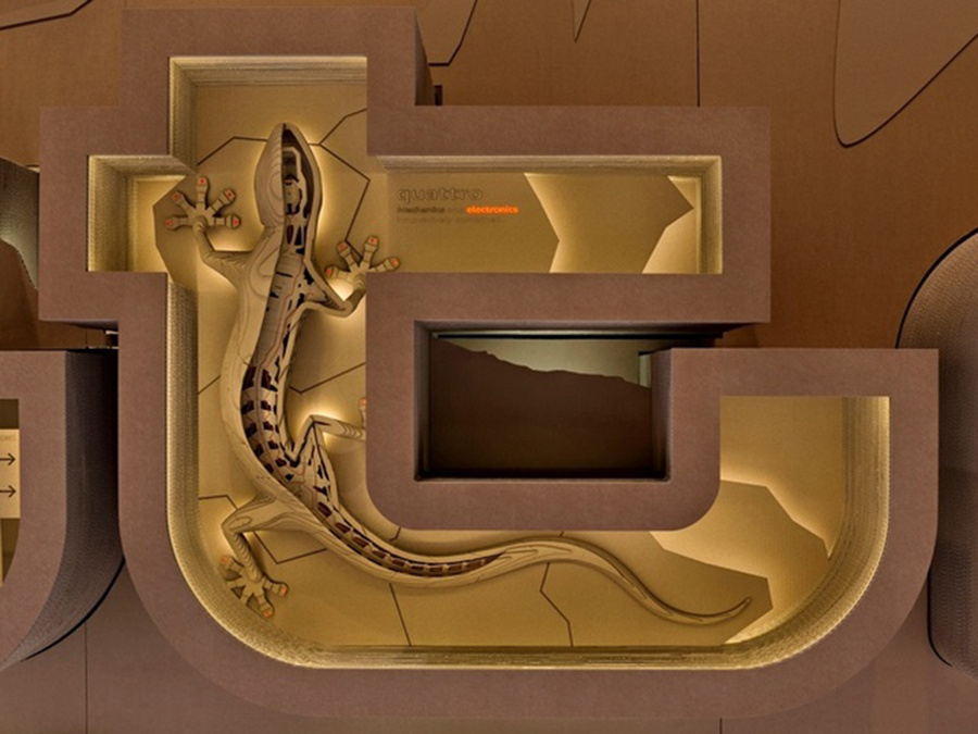 Messestand aus Pappe. In den Buchstaben waren 3D Collagen aus der Themenwelt von Audi.