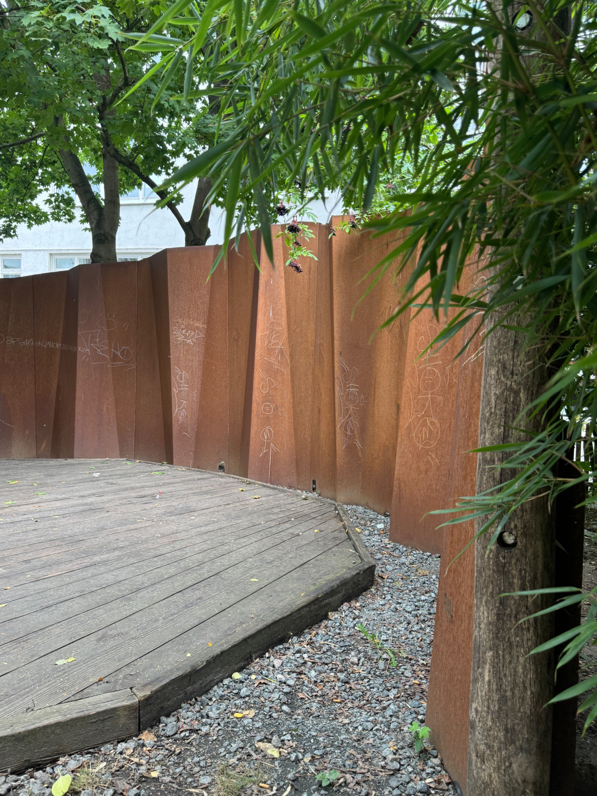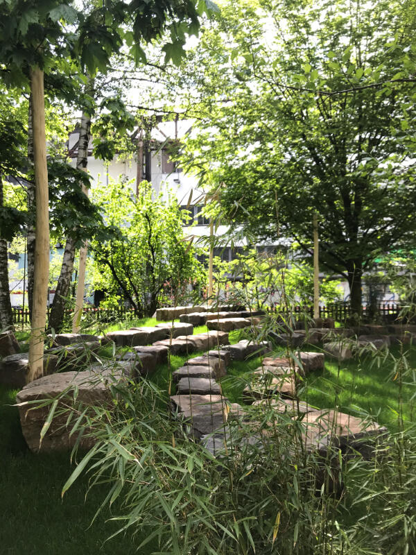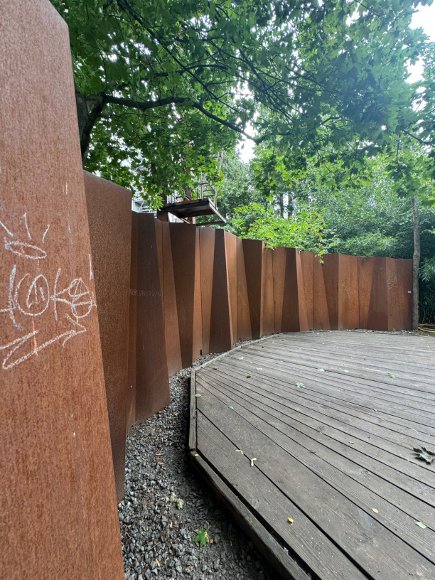 Aus gefaltetem Stahl, gebranntes Holz, Gras und vielen Tonnen Steinen.